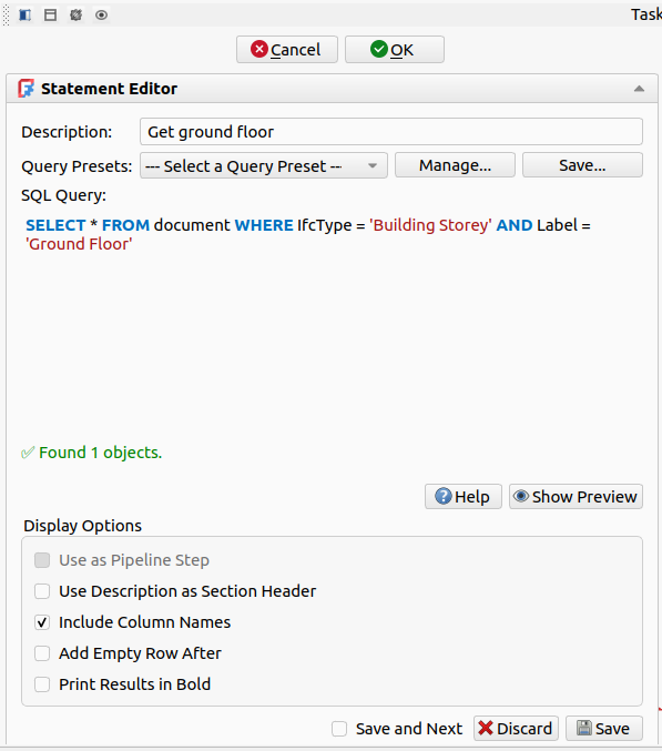 This section appears at the bottom of the Task Panel when you select a statement and click Edit Selected. This is where you write and configure an individual SQL query.