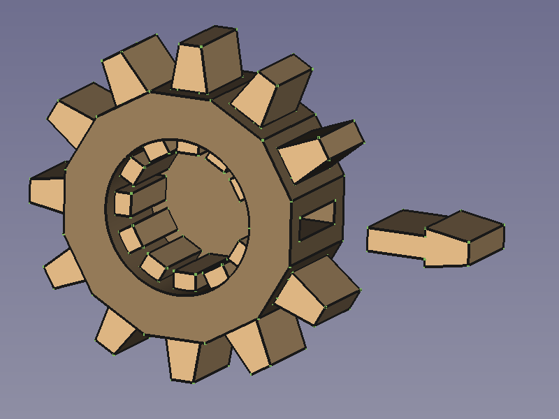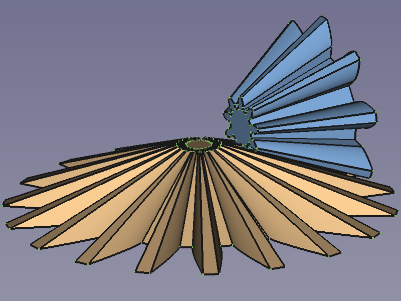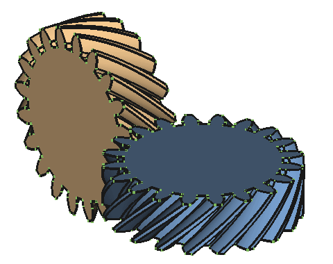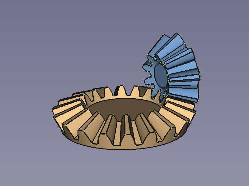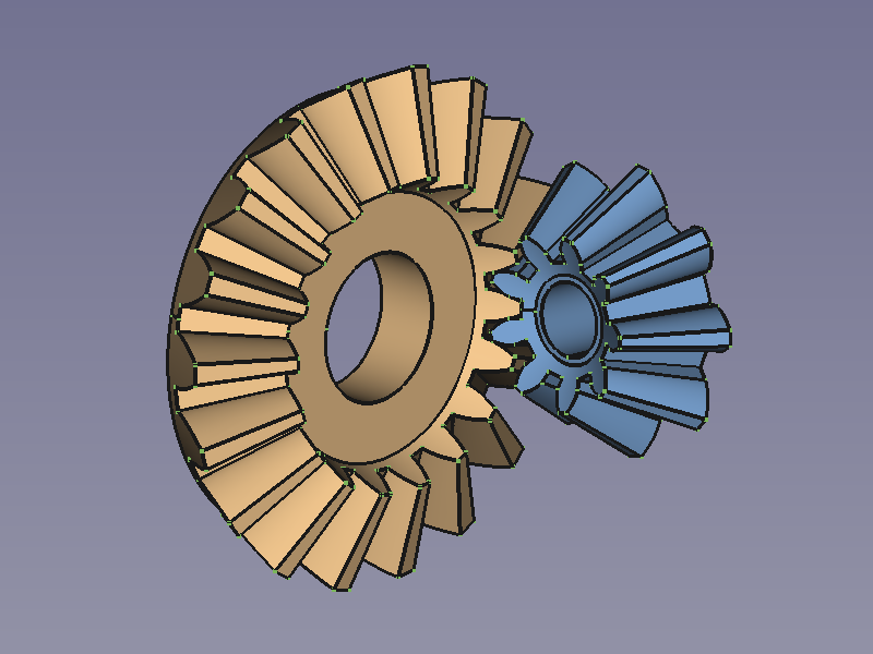 Left: Raw bevel gears as created with FCGear BevelGear. Right: Bevel gears trimmed to a more recognisable shape.