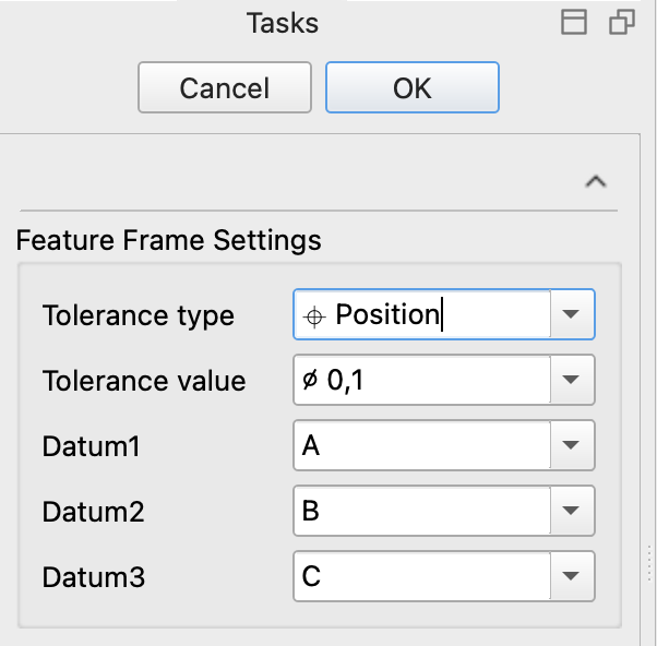 - Tolerance value: Sets the tolerance value in the second cell (and offers some predefined entries to have the diameter symbol at hand).