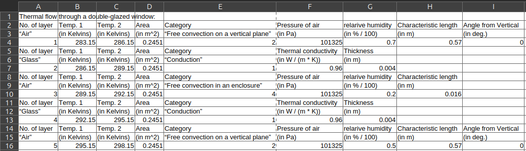 Die Eingabe der Daten muss in einer Tabelle in FreeCAD erfolgen, und die Ergebnisse werden in derselben Tabelle einige Zeilen unterhalb der zuletzt geschriebenen Zeile ausgegeben. Diese Eingabedaten müssen (in einer bestimmten Reihenfolge) die thermischen Eigenschaften der Materialien der Schichten, in denen der Wärmefluss stattfindet, die Dicke jeder Schicht, die Fläche, die Temperatur des ersten und letzten Punktes in Richtung des Wärmeflusses, die Art des Phänomens in jeder Schicht (z. B. Wärmeleitung, oder erzwungene Konvektion, oder freie Konvektion an einer horizontalen, vertikalen, geneigten Oberfläche oder einem geschlossenen Hohlraum). Die Ergebnisse sind die Wärmeleistungsrate (in Watt), die relative Genauigkeit der Berechnungen (der Algorithmus verwendet thermische Strömungsgleichungen und löst das Problem in Iterationen, wobei er versucht, zu konvergieren) und die berechneten Temperaturen der beiden Oberflächen auf jeder Schicht.
