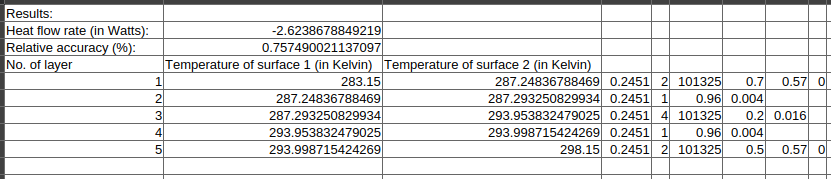 Temp. 2 ist die Temperatur der Außenfläche des Außenglases und wird grob auf 286,15 K geschätzt. Dies ist ein Anfangswert für den Löser, um die erste Iteration zu starten. Diese Temperatur wird berechnet und in den Ergebnissen dargestellt. Um einen Anfangswert zu schätzen, haben wir die folgende Gleichung verwendet: (25 - 10) / 5 = 3, wobei 25 °C die Innentemperatur, 10 °C die Außentemperatur und 5 die Anzahl der Schichten sind, sodass wir 3 zu 283,15 K addiert haben.