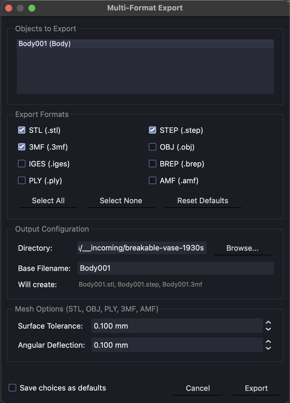 | Export selected bodies to multiple file formats (STL, STEP, 3MF, OBJ, IGES, BREP, PLY, AMF) simultaneously with a user-friendly dialog for format selection and output configuration. Macro version: 0.6.1 Last modified: 2026-01-12 FreeCAD version: 0.21+ Download: ToolBar Icon Author: Sean P. Kane |
